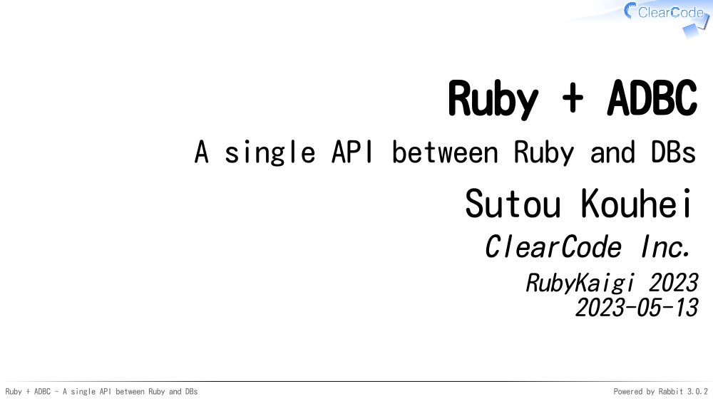 ・ 講演タイトル:Ruby + ADBC - A single API between Ruby and DBs