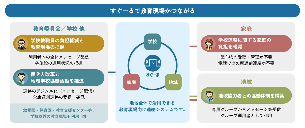 「すぐーる」は、当社が提供する情報共有ソリューション「Locas(ローキャス)」を構成するサービスのひとつで、「教職員の働き方改革」と「地域とともにある学校づくり」を支援する教育現場向け連絡システムです。
