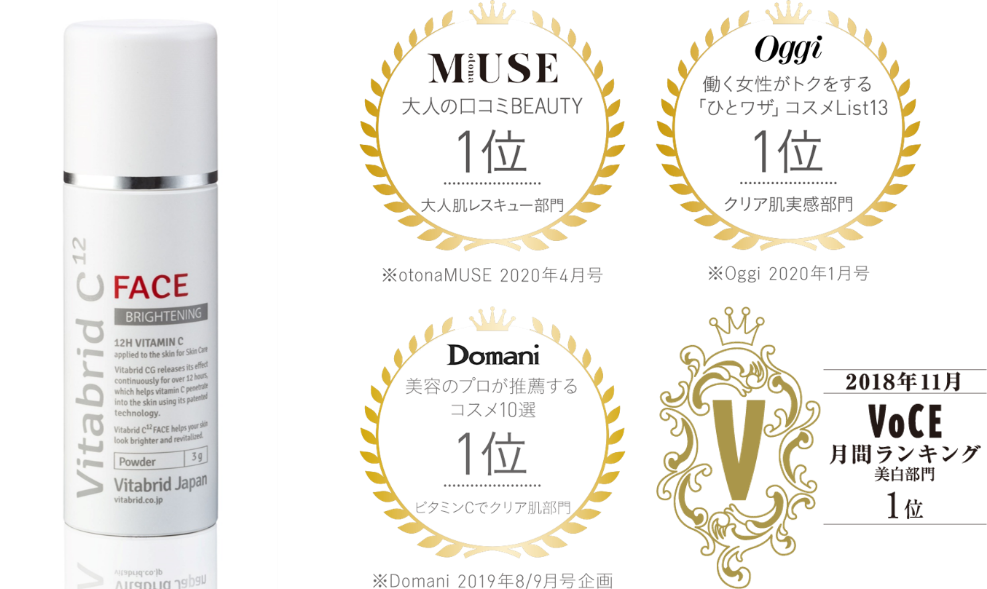 ※1 受賞タイトル一覧:「otonaMUSE」2020年4月号 大人肌レスキュー部門第1位/「Oggi」2020年1月号 クリア肌実感部門第1位/「Domani」2019年8/9月号 ビタミンCでクリア肌部門第1位/「VOCE」2018年11月度月間コスメランキング 美白部門第1位