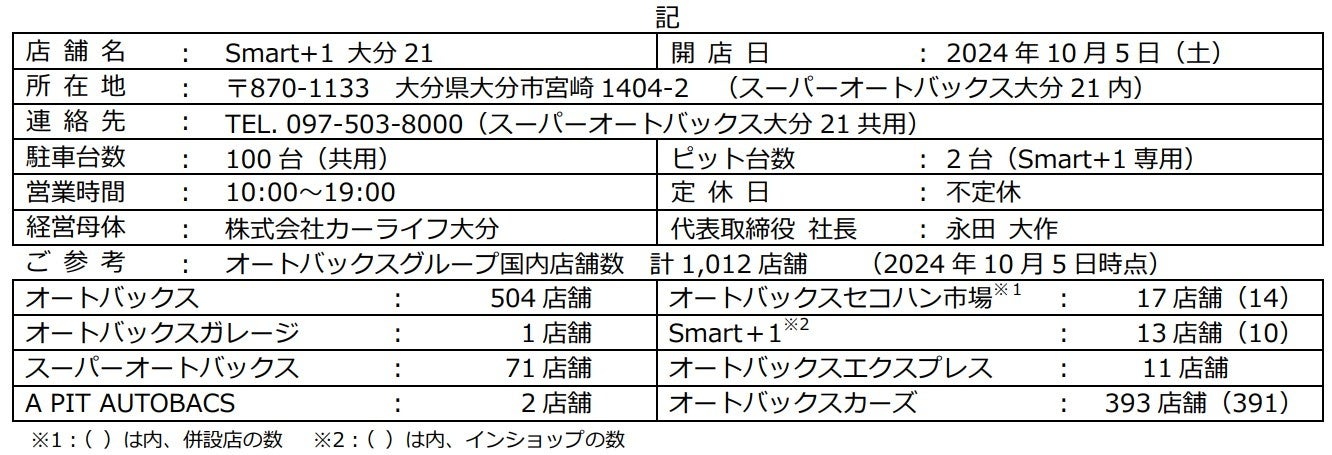 株式会社オートバックスセブン(代表取締役 社長:堀井勇吾)は、クルマのキレイを守る専門店「Smart+1大分21」を、大分県大分市にあるスーパーオートバックス大分21内に、2024年10月5日(土)にオープンします。
