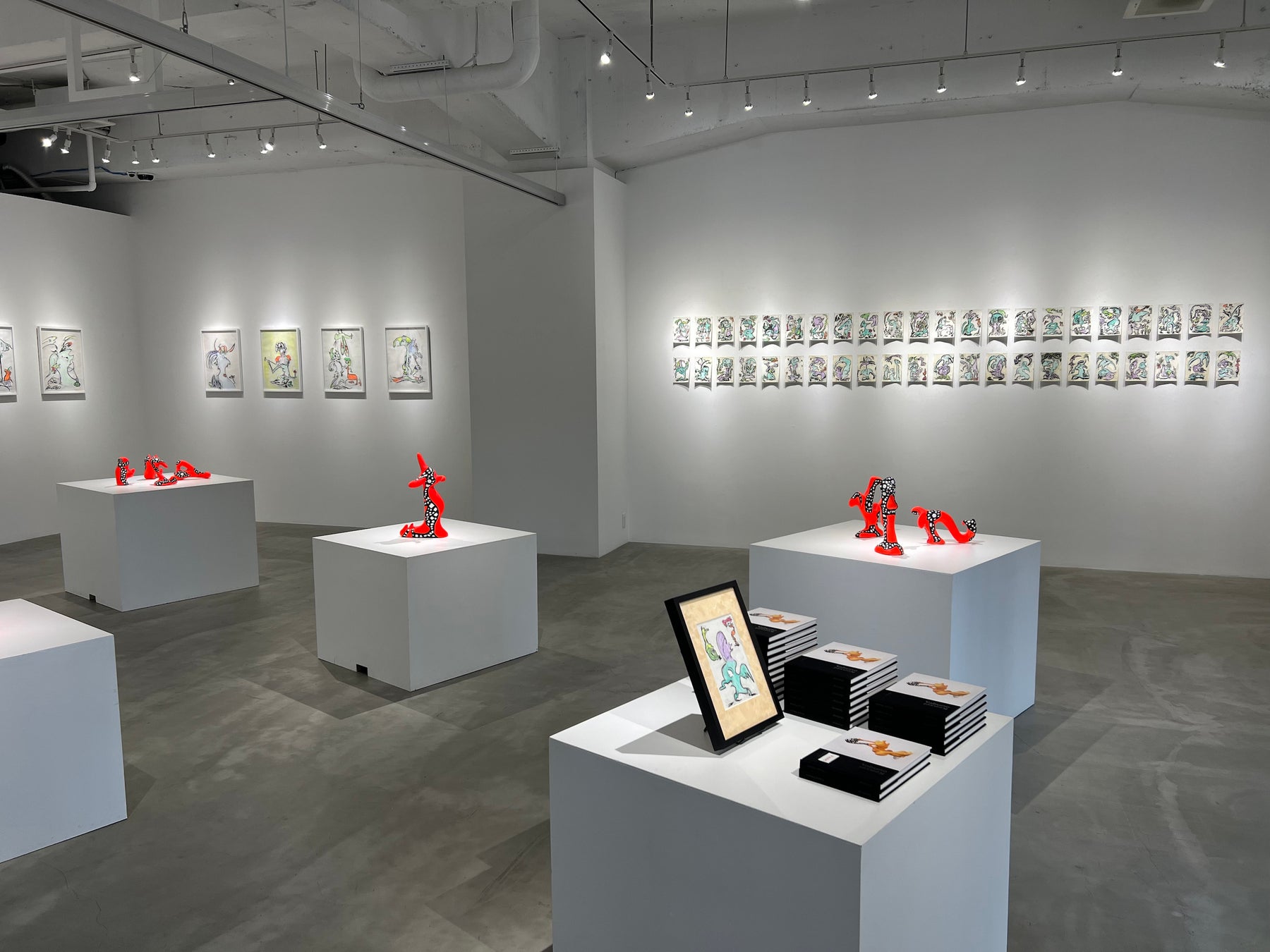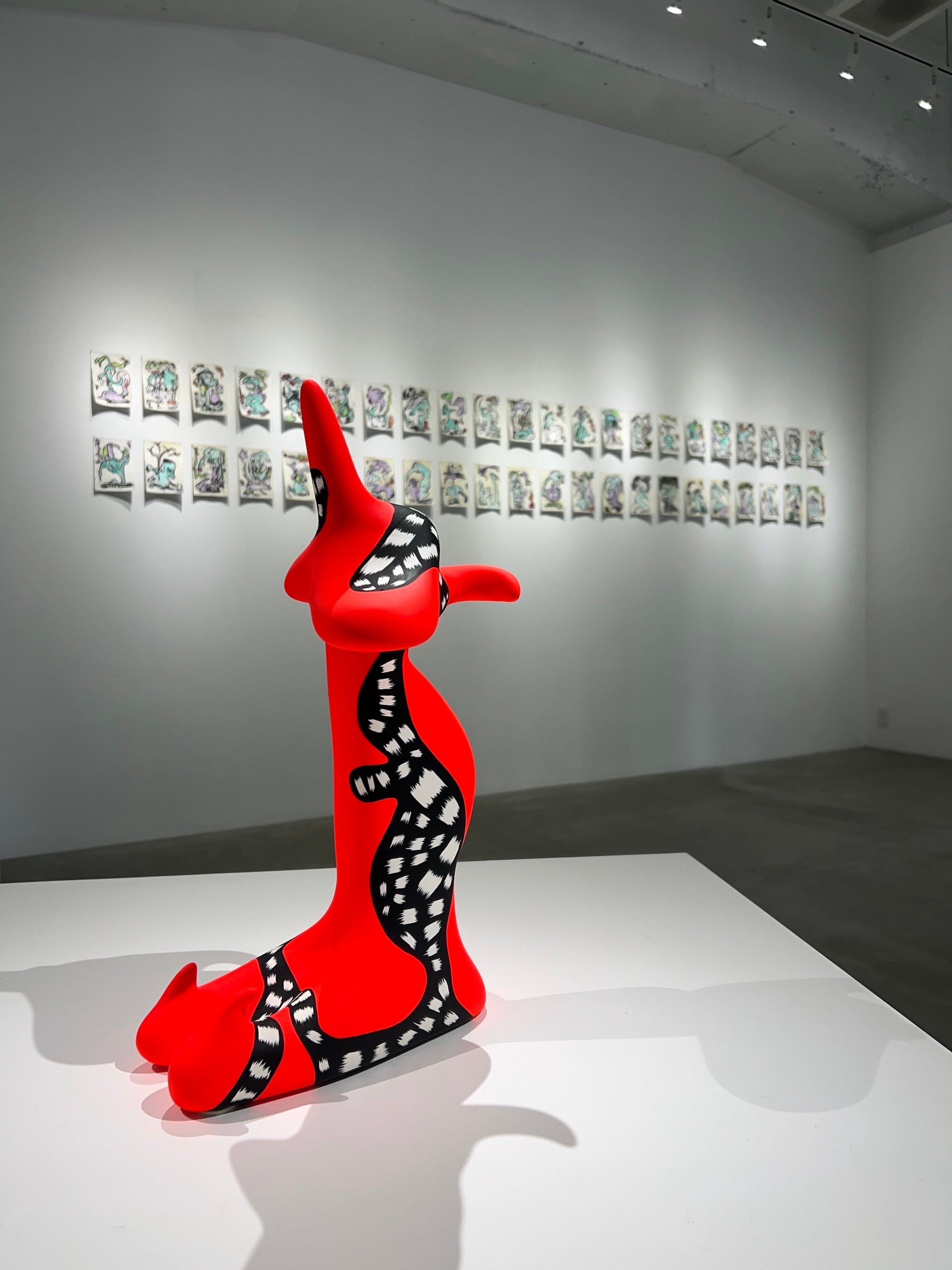 2000年代から作家活動をスタートし、初期作品では布にミシンで絵を、そしてドローイング、ペインティング、スカルプチャーと、さまざまな素材を扱い、表現を続けてきたKENSEI YABUNO。昨年の“MOSS”に続き、本展ではフルオレッセンス・カラーに着色された立体作品について「孤島でSOSをだしているUMA。ふと目の前に現れた虫に対して抱く情景から生まれた産物」と話します。丸みを帯びたキャンバスに描かれるのは「黒い水に浮かんだ、夢に対するコンポジション」。そして縦長のキャンバスには「つながりのない断片的な要素をコンポーズしました」。自身の作品が言語化されることに対して背いてきたKENSEI YABUNO。「真逆のものが交差する思考を彷徨う中、自分の未発達な部分、幼稚性とさらに向き合うことで、自分でも期待していない気づきがまた舞い降りてきたように思います」。