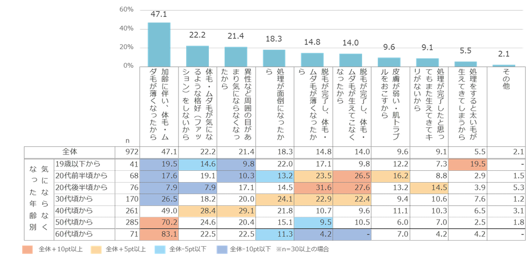 自身の体毛・ムダ毛について気にならなくなった理由 <気にならなくなった年齢別>