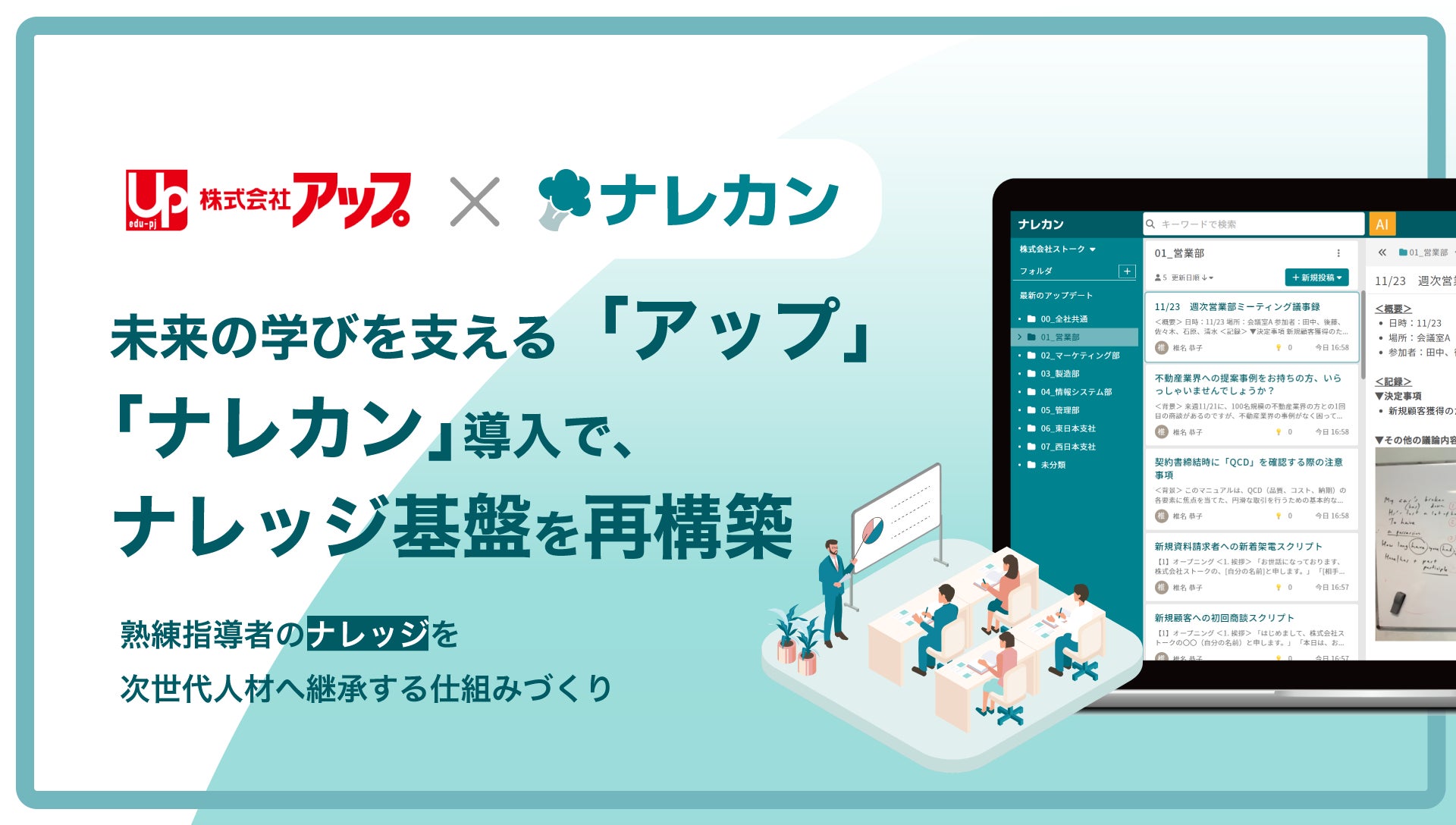 株式会社Stock(代表取締役社長:澤村大輔、本社:東京都中央区、以下「当社」)は、株式会社アップ(代表取締役社長:小南達男、本社:兵庫県西宮市、以下「アップ」)において、当社が提供するナレッジ管理ツール『ナレカン』が正式導入され、組織全体でのナレッジマネジメント体系の再構築が進んでいることをお知らせいたします。