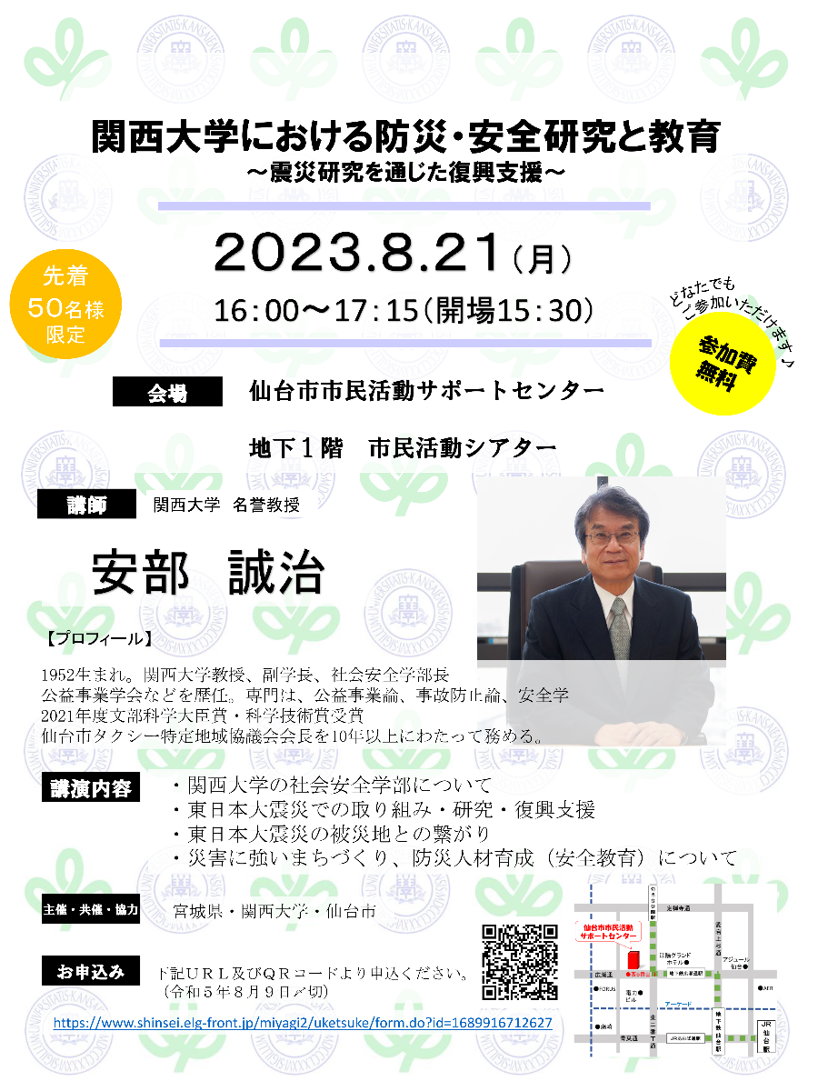 協定締結の背景には、被災地での研究を通じた復興支援や、学生団体によるボランティア活動を通した同県との強固な関係があることから、協定調印式に併せて、本学の安部誠治名誉教授による防災に関する講演会も実施します。