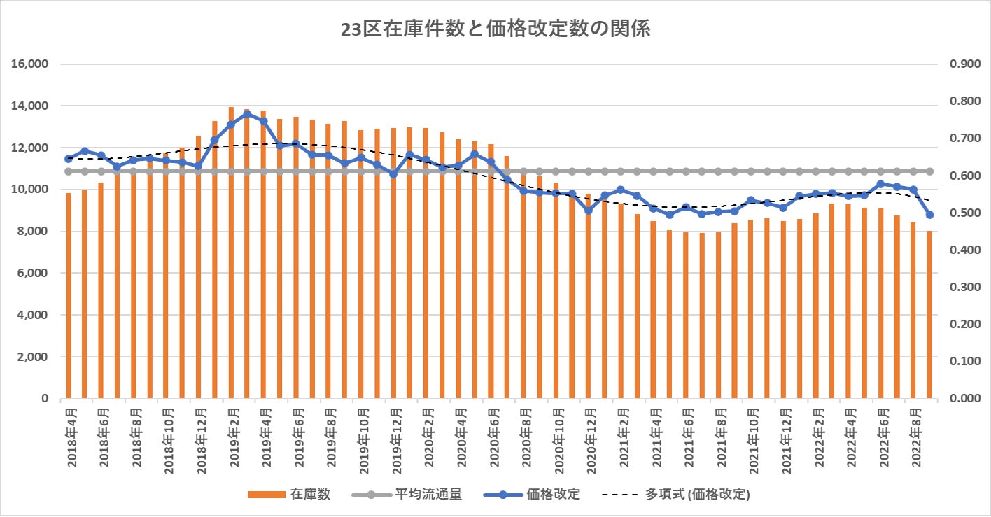 価格改定数も、東京都23区と同様、在庫数とほぼ連動しています。2022年9月は近年で最も低い水準になっており、トレンドを即座に反映していることがわかります。