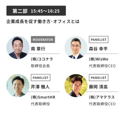 また、15時45分より開催されるパネルセッション「〜企業成長を促す働き方・オフィスとは〜」にて代表取締役CEOの藤岡がパネリストとして登壇いたします。スタートアップを経営する方や経営を志向する方向けに、現在の働き方のトレンドと実態などを語ります。藤岡も登壇後、取材対応いたします。