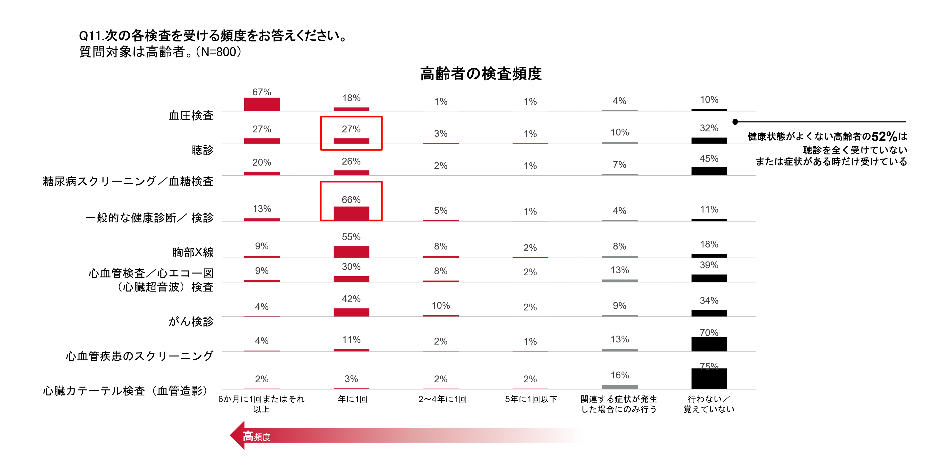 -また調査対象者のうち、健康状態が悪いと回答した高齢者の52%が、「心音のチェックを受けたことがない」または「症状があるときだけチェックを受けた」と回答しています。