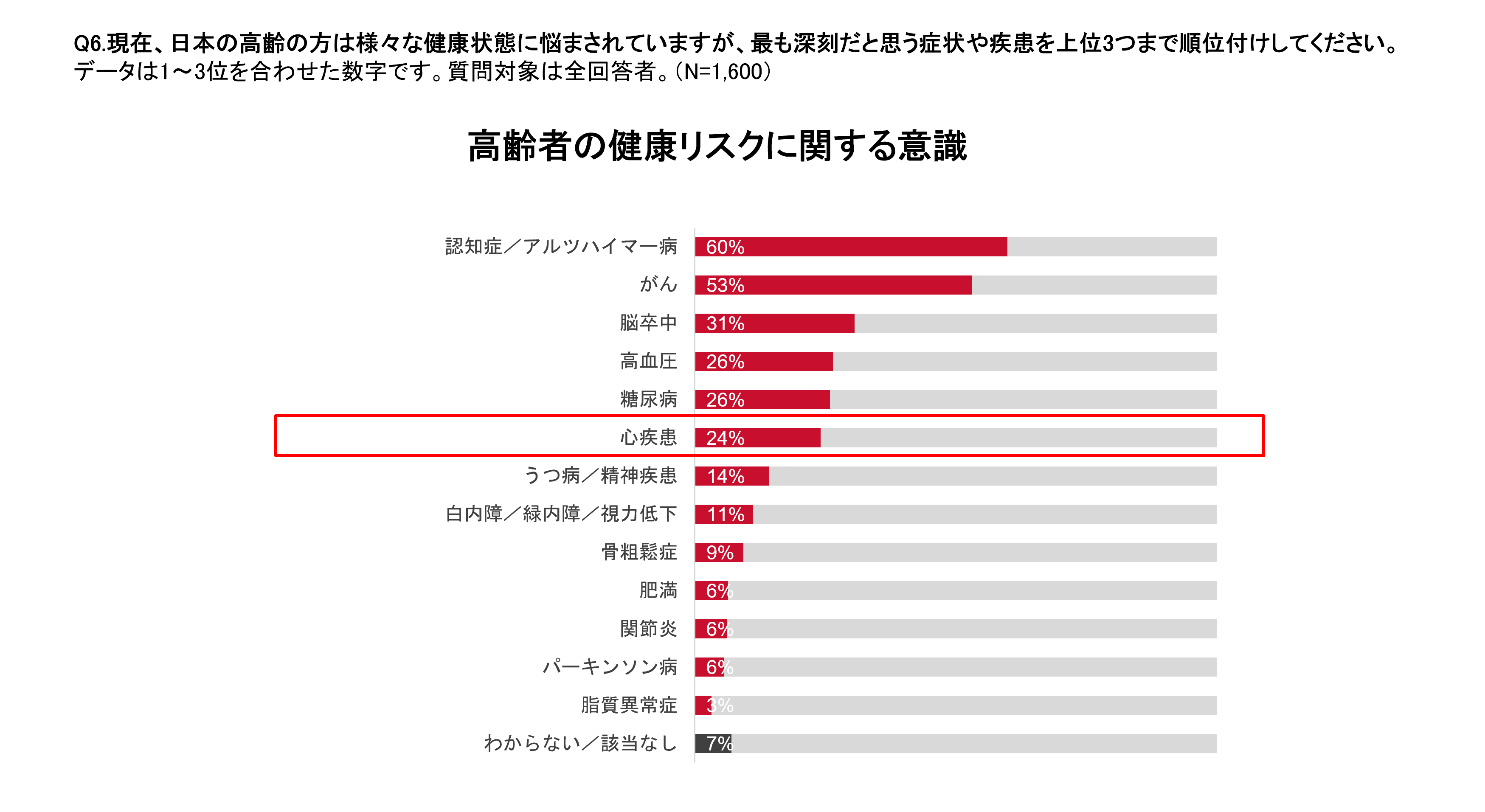- 心疾患は高齢者にとって、認知症やがんよりもリスクを感じられていない: