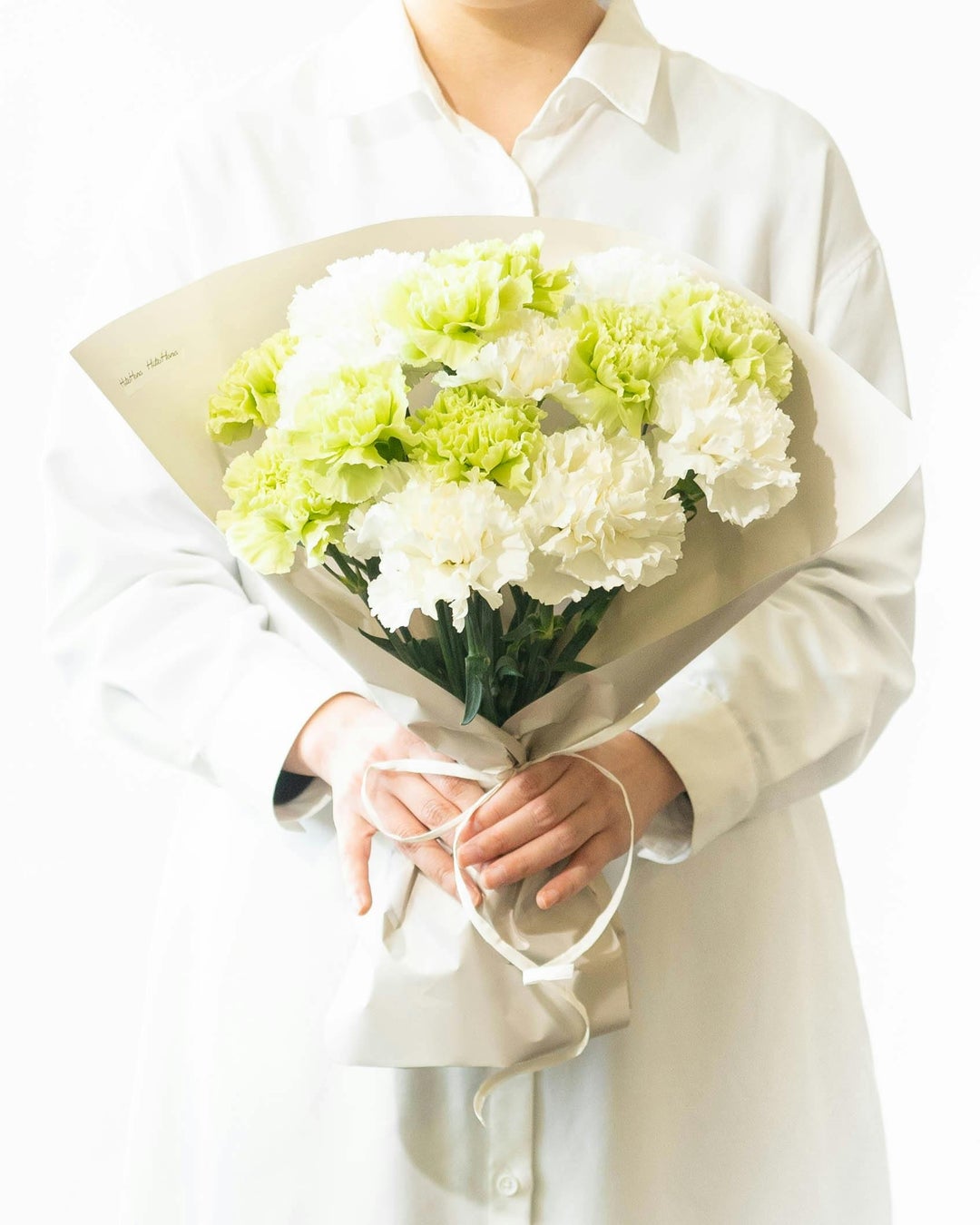 【母の日限定】産地直送 カーネーション花束 ホワイト・グリーンミックス(15本入り)/栃木 FloM carnation farmからお届け 5,280円税込