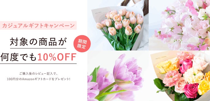 一人でも多くの方に産地直送のフレッシュなお花をお楽しみいただきたいという思いから、期間限定で10%オフでお楽しみいただけるキャンペーンを実施中です。ご自宅用に、カジュアルなプレゼント用に、ぜひこの機会にお試しください!