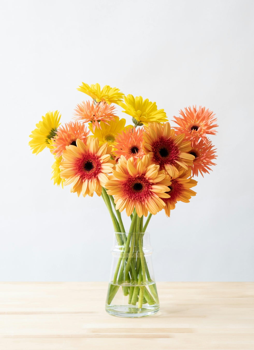 お花をプレゼントで贈ろうと思った際に、贈り先に花瓶があるかや、たくさんのお花をもらう機会だと花瓶が足りるかなど、心配になることも。松下園芸さんのガーベラは様々なギフトシーンでご利用いただいています。商品の長さにぴったりで、茎がまっすぐなガーベラをバランスよく飾っていただける花瓶をお花と一緒にお届けできるようになりました。