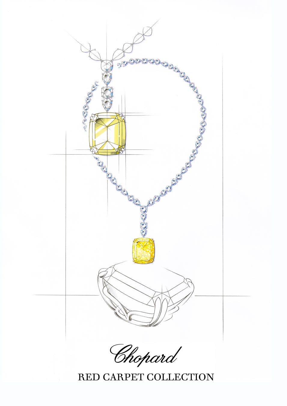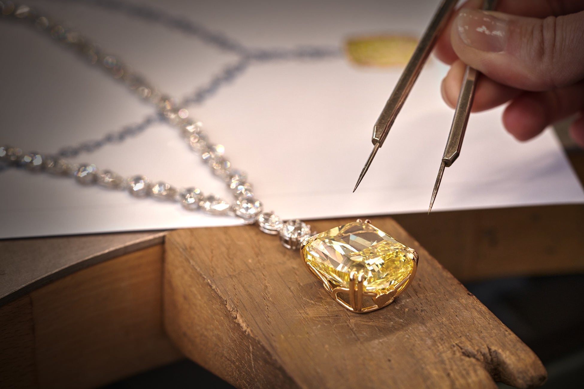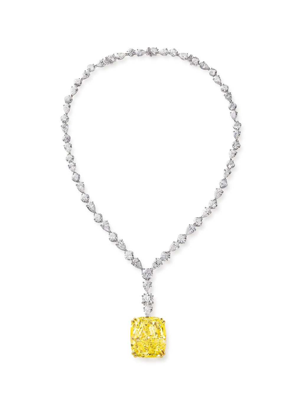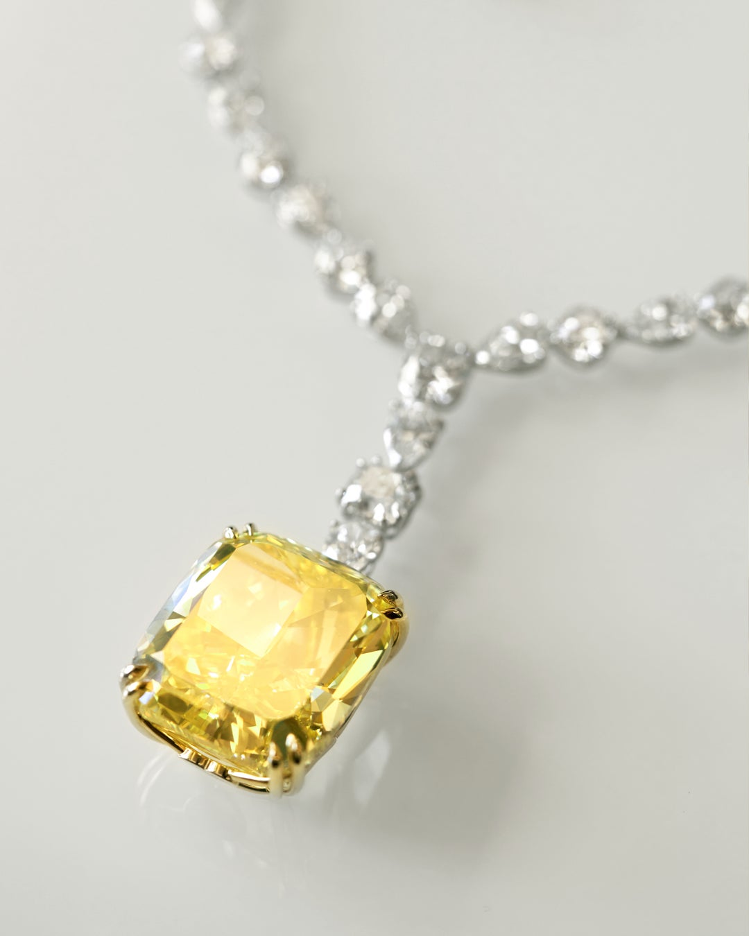 100カラットを超える桁外れのファンシーヴィヴィッドイエローダイヤモンドがひときわ目を引く、フェアマインド認証ゴールド&ダイヤモンドのゴージャスなネックレス。映画界のグローバルアイコン、ジュリア・ロバーツが、2016年にカンヌ国際映画祭のレッドカーペットで身に纏ったユニークなジュエリーへのオマージュ。