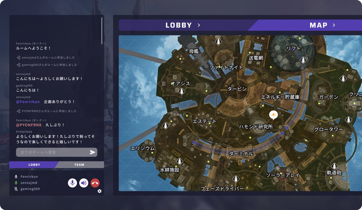チーム結成後からスペース内でグループを立ち上げることができます。マップを見ながらの作戦会議や、ゲーム終了後の分析にも使えるため、次のゲームの対策を素早くまとめられます。