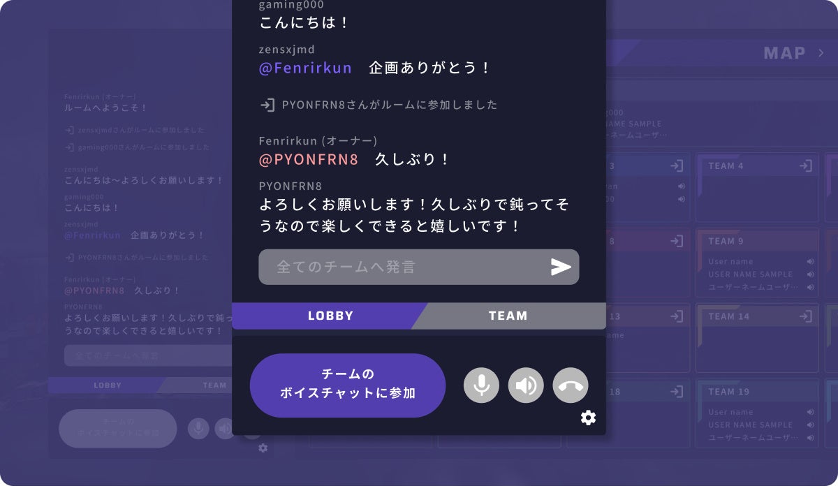 作戦ルームでチームメンバーと自由にチャットができます。テキストとボイスチャットを自在に切り替えてコミュニケーションが取れます。