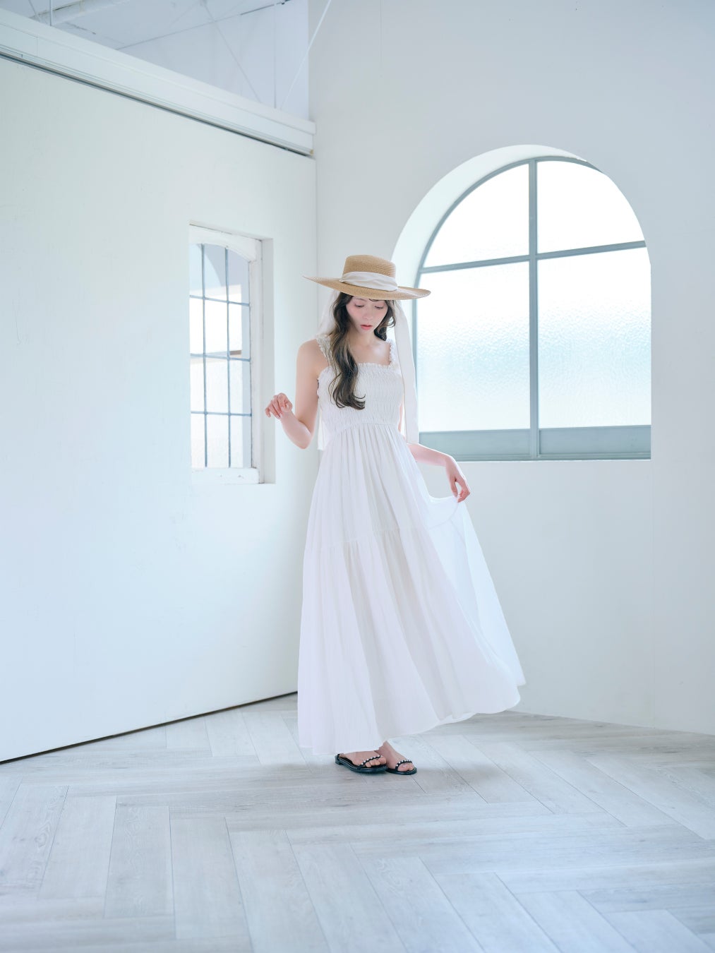 裾のたっぷり感がくるくる回りたくなるくらい可愛くて、特に好きなアイテムでした。正面はすごく正統派なのに、後ろは肌見せといったポイントがあって、靴の合わせ方でカジュアルにもドレスにも振れるのが好みです。トングサンダル合わせでも崩しすぎず着られますね。