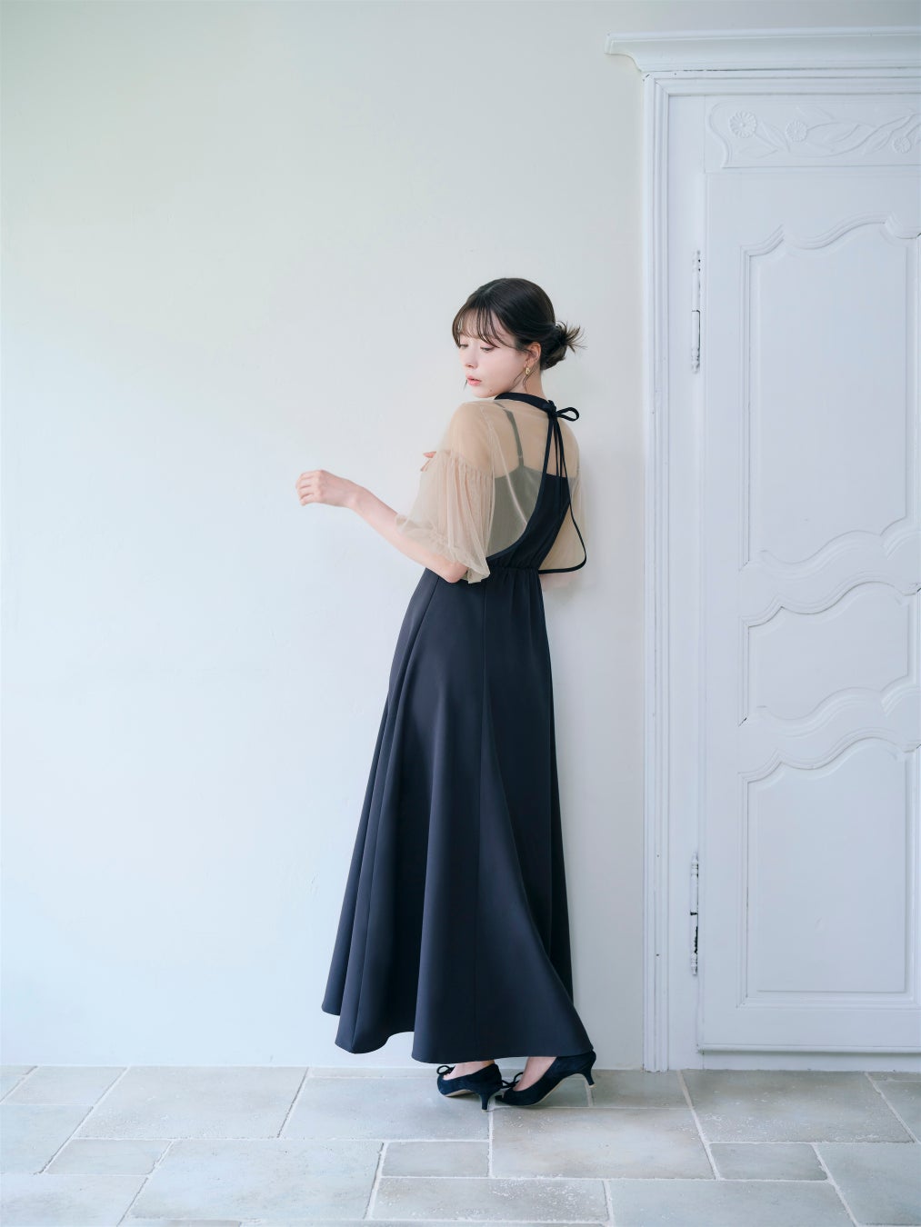 ゆるやかなセミマーメイドシルエットが女性らしく、 上品なボディラインを演出してくれるワンピース。 バックスタイルが映えるキュートな2段リボンデザインのシアーシャツと合わせて、 夏らしい大人なフェミニンコーデに。