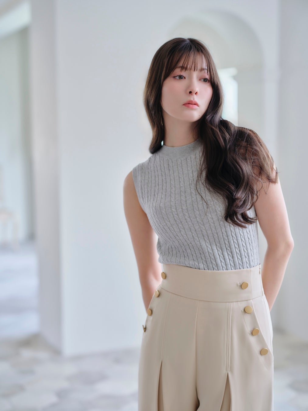 女性らしいやわらかな表情が魅力のケーブル柄ニットと 上品なゴールド釦が目を惹くマリンパンツを合わせた、 シンプルながら洗練された大人な装いに。