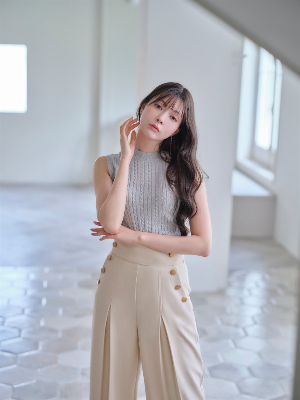色っぽカジュアルな感じで、上のピタッとしたニットと下のゆるっとしたパンツのバランスが好きでした。パンツは前の方にタックが入っていたり、ゴールドのボタンがちょっとマリンっぽかったりと、細かいポイントが可愛いし、上のトップスも何にでも合いそうだなと思いました。