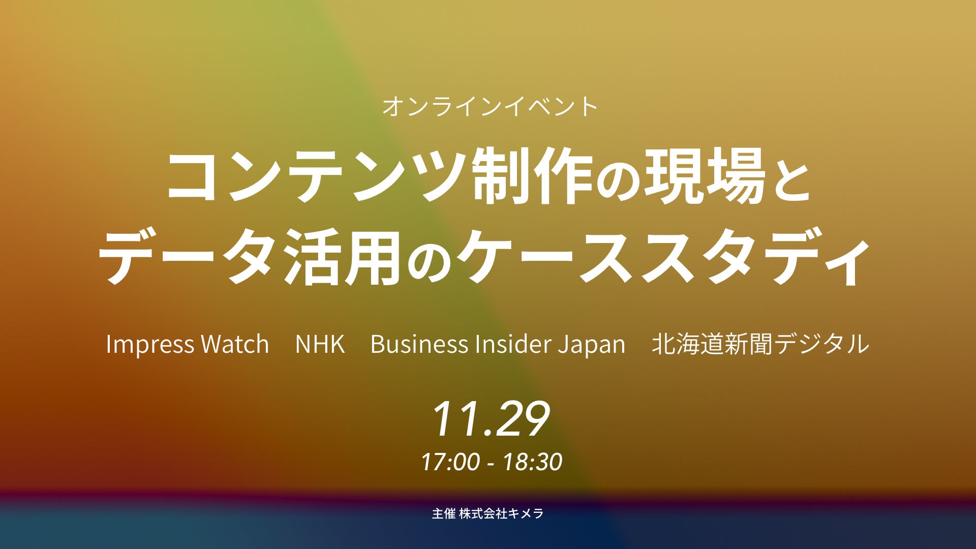 2023年11月29日(水)に開催されるオンラインイベント「コンテンツ制作の現場とデータ活用のケーススタディ」ではImpress Watch、NHK、Business Insider Japan、北海道新聞デジタルからゲストを迎え、コンテンツ制作の現場でのデータ活用、データとどのように接しどう活かしているのかを4社それぞれの経験からお話いただきます。具体的な運用方法や課題への取り組みなどをケーススタディとして共有します。