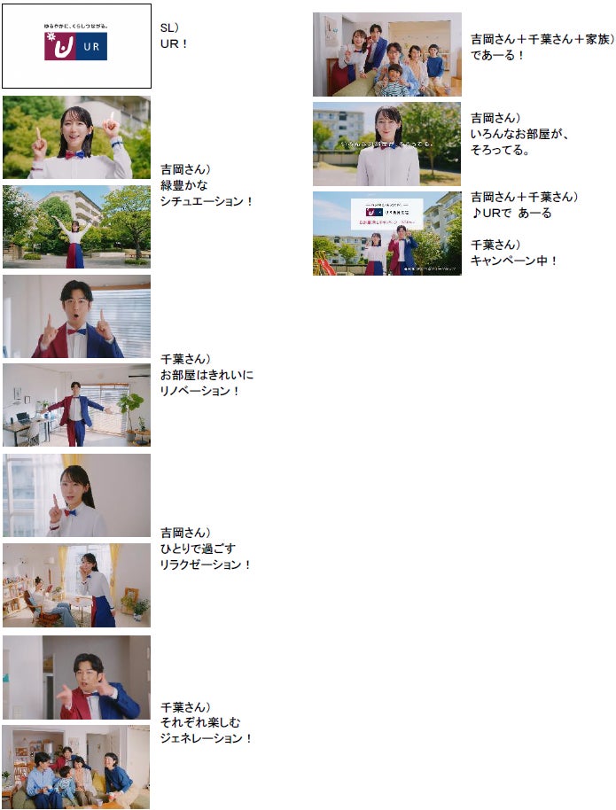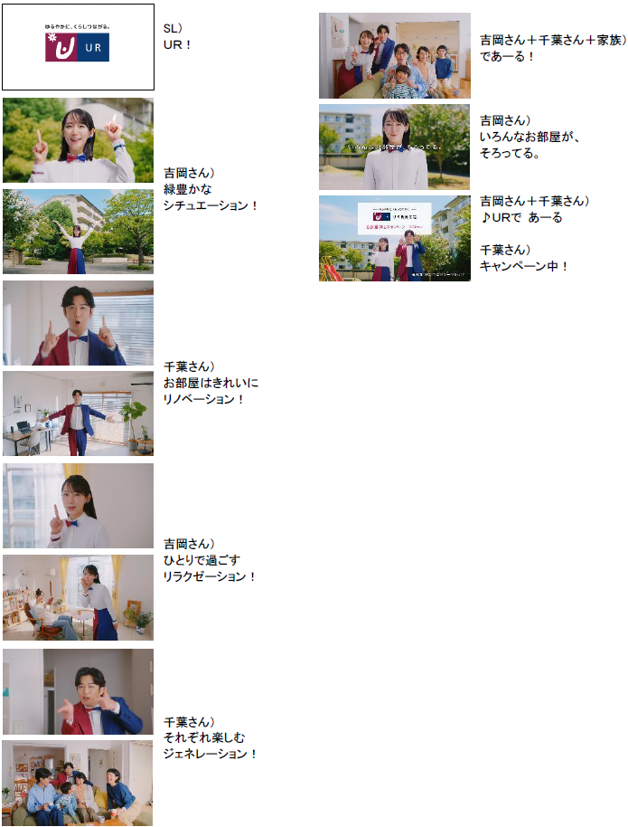 「かわつるグリーンタウン」の自然あふれる広々とした敷地内に立ち、「緑が豊かなシチュエーション!」とアピールする吉岡さん。続いて、千葉さんは「お部屋はきれいにリノベーション!」と、リノベーションされたばかりのお部屋を紹介し、吉岡さんは「ひとりで過ごすリラクゼーション!」と女性が読書しながらお部屋でくつろいでいる姿を伝えます。そして、「それぞれ楽しむジェネレーション!」と3世代が集うご家族のお部屋を訪れた千葉さん。そこへ吉岡さんも加わって、ご家族とともに「であーる!」とカメラ目線でポーズを決めます。敷地内の広場に立ち、「いろんなお部屋が、そろってる」とカメラ目線で呼びかける吉岡さん。最後は千葉さんと一緒に「URであーる♪」と呼びかけるカットで締めくくられます。