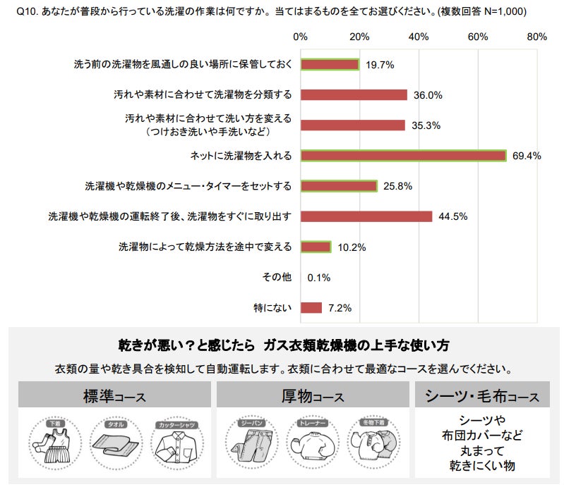 洗濯物の扱いについて、普段から行っている洗濯の作業を聞きました。その結果、最も多い回答は「ネットに洗濯 物を入れる」の7割でした。反対に、最も少ない回答は「洗濯物によって乾燥方法を途中で変える」の1割、続いて 「洗う前の洗濯物を風通しの良い場所に保管しておく」の2割でした。「洗濯機や乾燥機のメニュー・タイマーをセットする」は3割に留まりました。