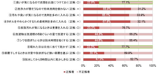 洗濯ブラザーズ監修「正しい洗濯チェックテスト」 正しい洗濯方法を理解している“洗濯優等生”は1割という結果に 特に間違いが多い項目は「⑧晴れた日は日光に当てて乾かす(正解は×) 」