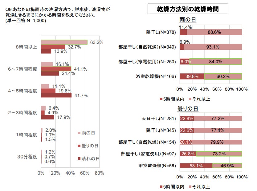 梅雨時の洗濯方法について、脱水後に洗濯物が乾燥しきるまでにかかる時間を聞きました。その結果、雨の日は 「8時間以上」、曇りの日は「6~7時間」が最も多い回答でした。また、乾燥方法別に比較した場合、家電を使用した部屋干しや浴室乾燥機の利用でも、半数近くが5時間以上かけていることが分かりました。