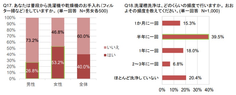 洗濯機や乾燥機のお手入れも重要です。普段からお手入れできている割合は、女性の場合は5割でしたが、男性 は3割に留まりました。さらに、カビ対策で必須となる洗濯槽洗浄の頻度についても聞きました。その結果、「半年に一回」が4割と最も多く、理想となる「1か月に一回」の洗浄ができている方は2割に満たないことが判明しました。