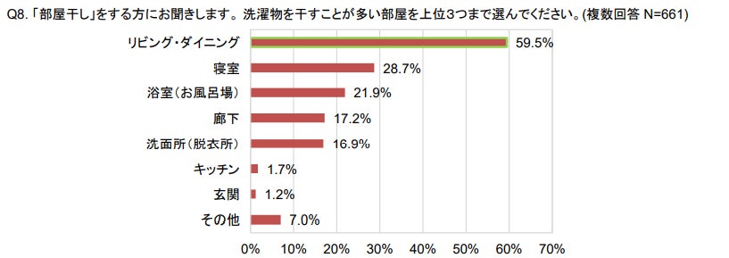 部屋干しをする方に洗濯物を干すことが多い部屋を聞きました。その結果、「リビング・ダイニング」が6割と、家の中で比較的広い部屋を選ぶ方が最も多いことが分かりました。