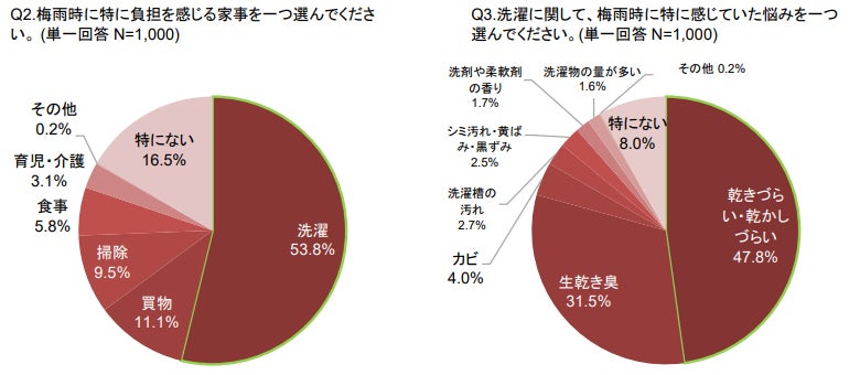梅雨時に負担を感じる家事を聞きました。その結果、半数以上が「洗濯」、続いて1割が「買物」「掃除」と回答しました。また、洗濯の悩みとして最も多いのが5割の「乾きづらい・乾かしづらい」、続いて3割の「生乾き臭」でした。
