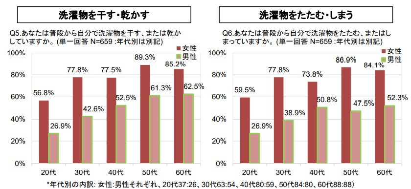 男性と女性で普段から自分で洗濯物を「干す・乾かす」「たたむ・しまう」か聞いた結果比べると、どの年代も男性が女性を下回りました。