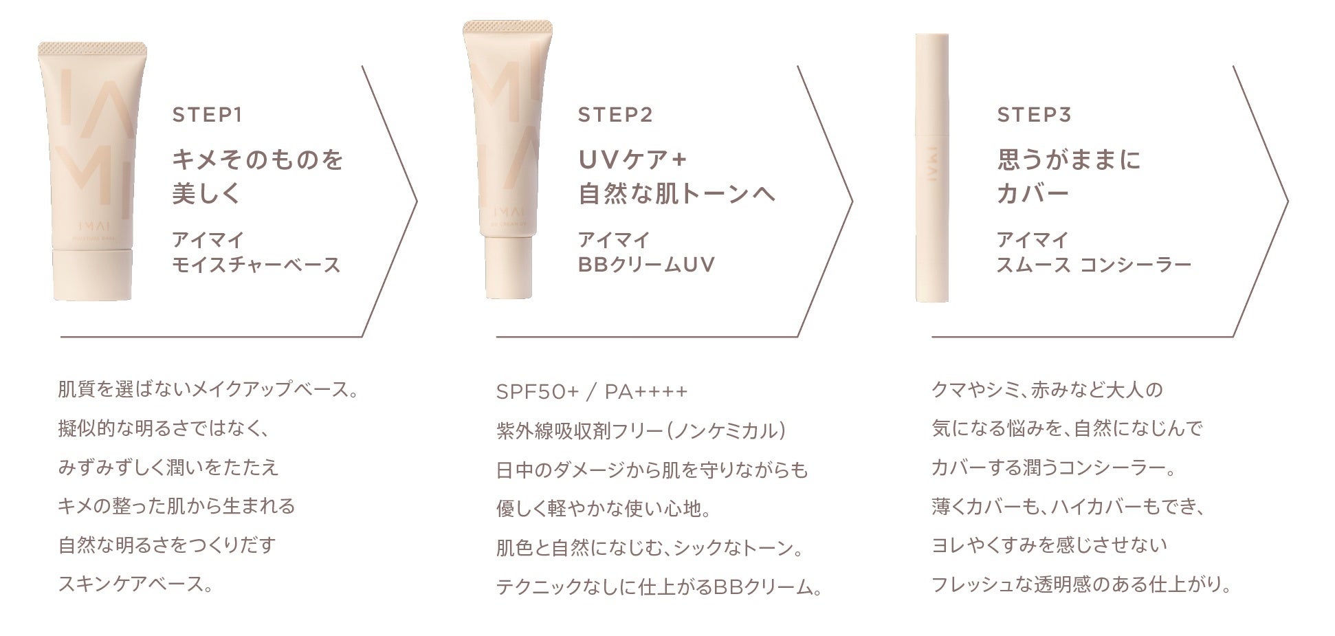 IMAIは、自分になじみ着心地のいい服を纏うように、自分の肌を自然体で包み込む、3つのベースメイクアイテムからはじまります。