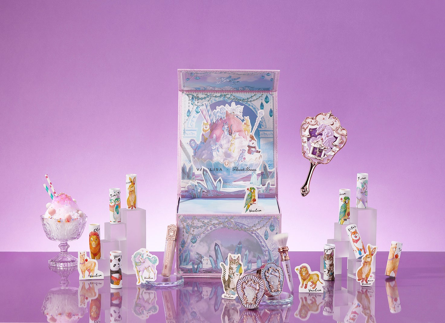 VASILISAのパフュームスティックも、FlowerKnowsのクリスタルユニコーンシリーズも、この夏の終わりにかけて涼しさと楽しさを運んでくれます。 FlowerKnowsのクリスタルユニコーンシリーズが、乙女心をかきたてる繊細でキュートなメイクで女の子の心をときめかせてくれます。 VASILISAのパフュームスティックは、愛らしい香りに包まれ、元気で可憐な雰囲気を纏います。甘く爽やかで、愛らしく夢のような、VASILISAとFlowerKnowsの共同ギフトボックスは、夏の終わりにひとときの涼しさを与えてくれます。 この夢のようなボックスでは、まばゆいばかりのクリスタルのイラストがあしらわれ、甘いピンクのかき氷には、FlowerKnowsのユニコーンとVASILISAの愛らしい動物たちが涼しげに描かれています。 ギフトボックスを開けると、別世界のようなデザインの折り込みカードがあり、思わず飛び込みたくなるような、夢のような涼しげな風に包まれる、癒しの空間に身を浸すことができます。