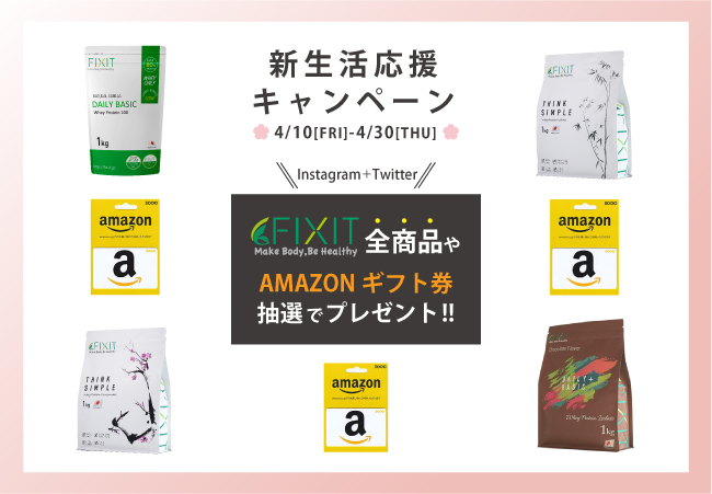 プロテイン『DAILY BASIC』『THINK SIMPLE』で多数のランキング1位※を獲得した、フィットネスブランド「FIXIT」(株式会社FIXIT:大阪府大阪市)は、いつも応援して下さっている皆さんの新生活をサポート出来ればと思い、4月10日より「新生活応援キャンペーン」をInstagram、Twitterにて開催しております。