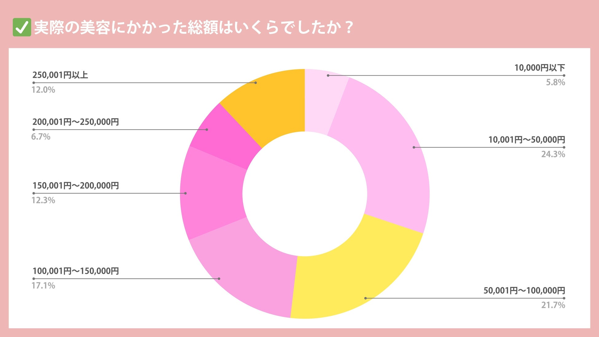 「結婚式に向けて美容にかけた総額は?」という質問に対し、最も多かったのは「5万円〜10万円」。また、「25万円以上」と回答した人も12%以上にのぼり、結婚式を迎えるにあたり、多くの花嫁が美容への投資を重要視していることが分かりました。特に、写真や映像に残る一生に一度の瞬間に向けて、自身のベストな状態を作り上げるための準備に力を入れていることがうかがえます。