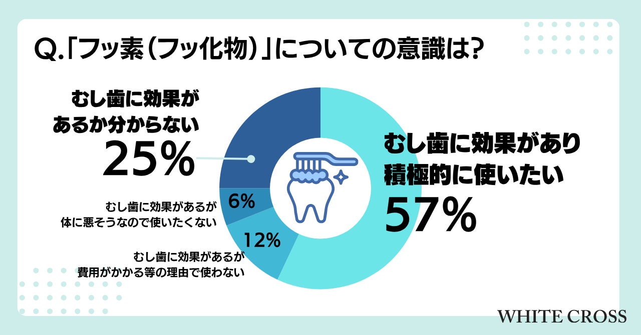最近では、歯科医院で塗布してもらったり、歯磨き粉などの商品に配合されることが多い「フッ化物(フッ素)」についての意識では、「むし歯に効果があり積極的に使いたい」という保護者が57%と過半数を超えています。