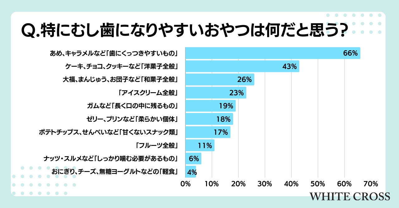 むし歯になりやすいおやつについての意識では、あめ、キャラメルなど「歯にくっつきやすいもの」が66%、次いで、ケーキ、チョコ、クッキーなど「洋菓子全般」が43%という結果がでました。