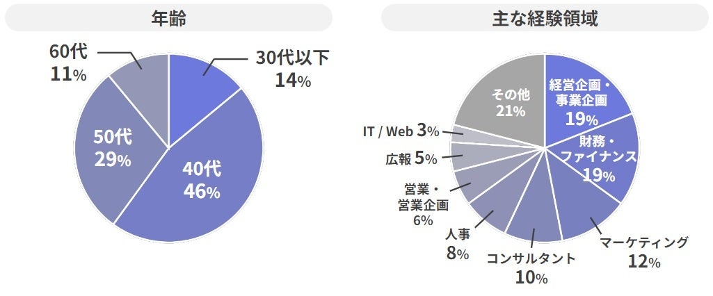 ご年齢は40代、50代が中心。おもなご経験領域としては経営企画・事業企画・財務・ファイナンスがあわせて約40%を占め(下図)、経営ないし経営に近いポジションで実務経験を重ねてきた女性たちが中心です。また公認会計士・弁護士の方も合計100名以上ご登録いただいているほか、サステナビリティ、DX、女性活躍、DE&I推進などの知見をもつ人材も数多くご登録いただいています。
