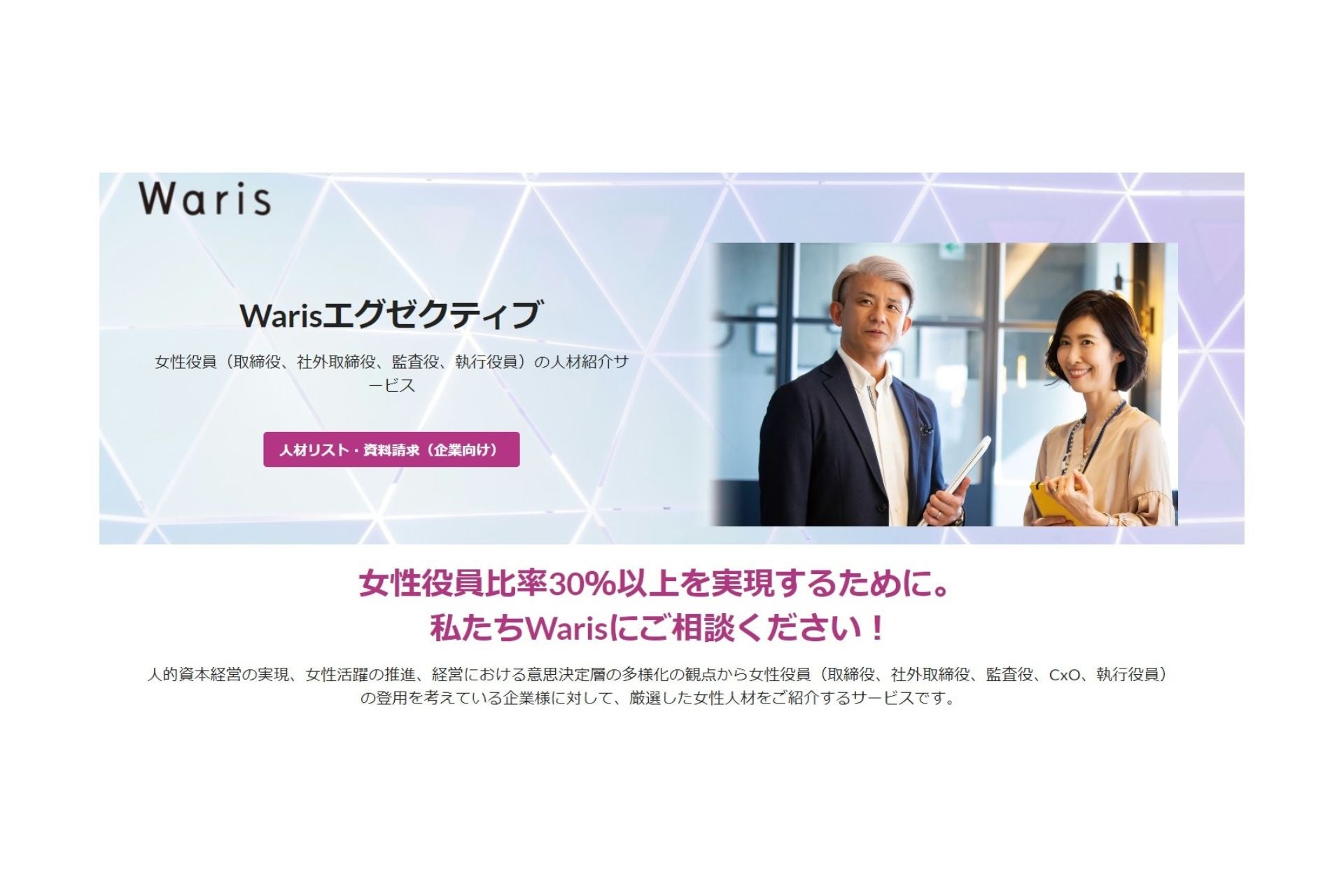 女性の多様な働き方への支援を通じて、すべての人の自分らしい人生を応援する人材サービス企業株式会社Waris(所在地:東京都千代田区、代表取締役:米倉史夏、田中美和、河京子、以下Waris)は、女性役員紹介紹介サービス「Warisエグゼクティブ」に登録する女性エグゼクティブ数が1,000人を超えたことをお知らせします。これからも本事業を通じて経営における意思決定層の多様化および経営層におけるジェンダー平等実現により「誰もが自分らしく生きられる社会づくり」に貢献してまいります。