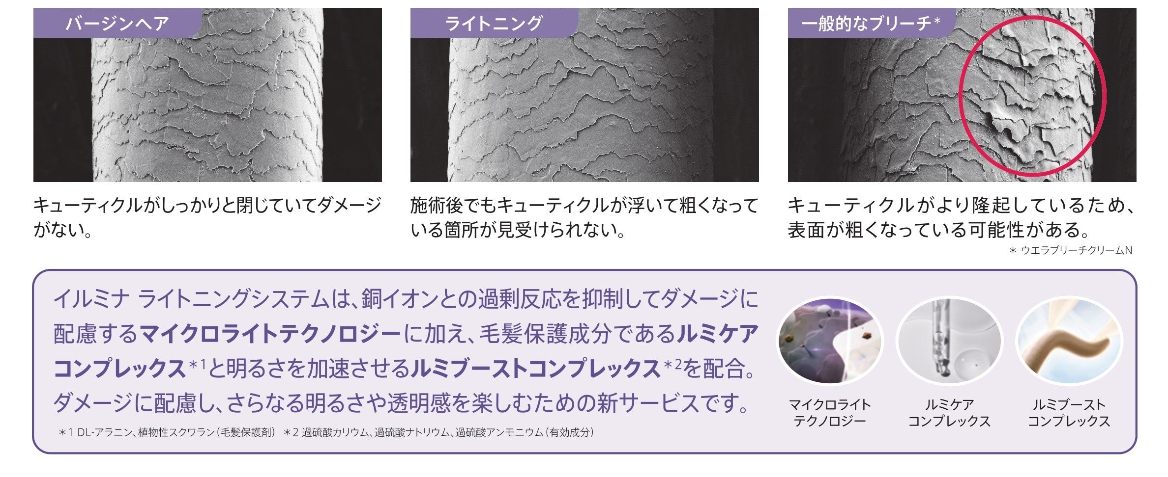 「イルミナ ライトニングシステム」はイルミナライトニング*5、イルミナライトニングブースター*6、イルミナ クリームディベロッパーを1:1:4の割合で混合して使用する新たなライトニングシステムで、銅イオンとの過剰反応を抑制してダメージに配慮するマイクロライトテクノロジーに加え、毛髪保護成分であるルミケアコンプレックス*7 と明るさを加速させるルミブーストコンプレックス*8 を配合することで、ダメージに配慮し、さらなる明るさや透明感を表現することが可能になりました。