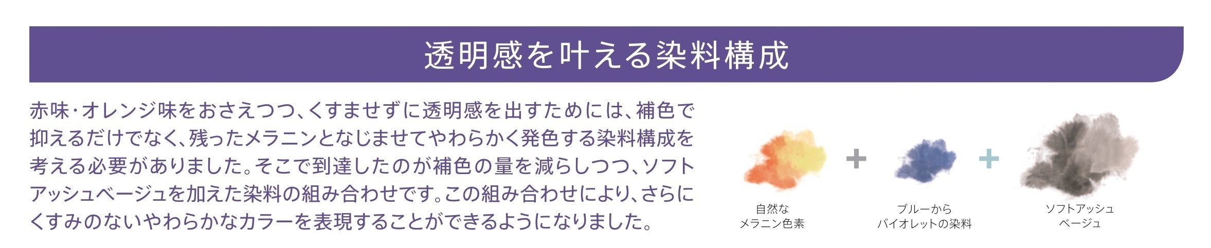 昨年発売した「L.A. Collection」同様、補色の量を減らしつつ、ソフトアッシュベージュを加えた染料構成を採用することで、日本人特有の赤味・オレンジ味を抑え、さらにくすみのないやわらかなカラーを表現することが可能になりました。