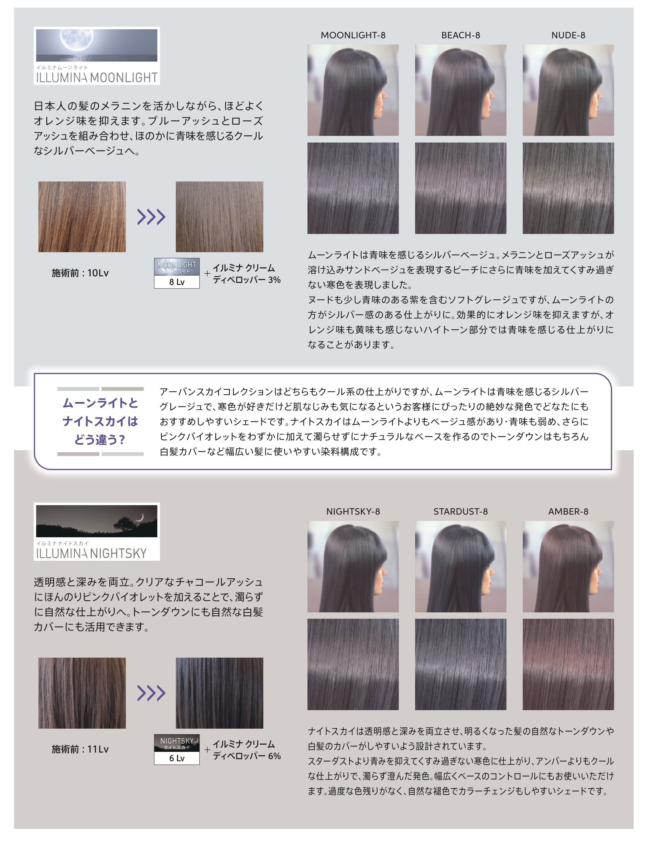今回の「アーバンスカイコレクション」では、赤味・オレンジ味は抑えたいけど、くすみすぎて顔まで疲れて見えるのは避けたいという消費者のニーズを叶える、透明感あふれる新たなグレー系シェードとして、やわらかな月明かりの輝きのようなシアーシルバーをイメージした「イルミナムーンライト」と、澄み渡る夜空のようなチャコールグレージュを表現する「イルミナナイトスカイ」の2シェードを展開いたします。