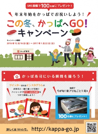 かっぱ寿司(カッパ・クリエイト㈱ 本社:神奈川県横浜市 代表取締役社長 四方田豊)は、2016年12年16日(金)~2017年1月22日(日)の期間、「この冬、かっぱへGO!キャンペーン」を開催いたします。