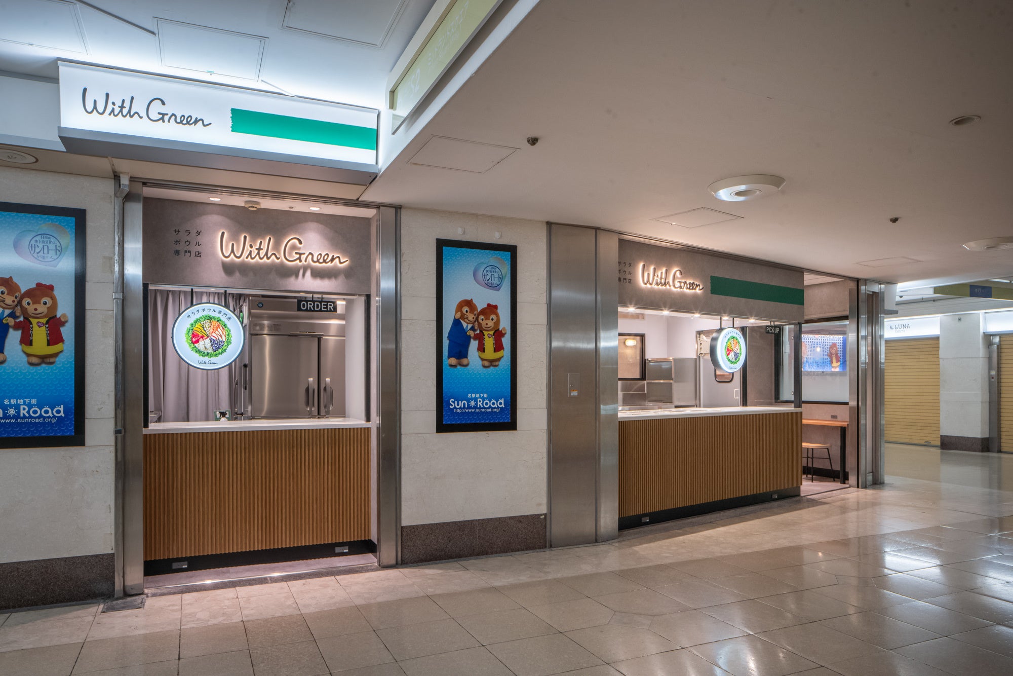 WithGreenは、東京を中心に関東・関西・中部・九州で展開しており、『WithGreen 名古屋サンロード店』で23店舗となります。2023年の出店は7店舗目となります。『WithGreen 名古屋サンロード店』は、「くらし」「あそび」「仕事」で名古屋駅周辺を利用されるすべての方々に、イートイン・テイクアウト・デリバリーでサラダを提供していきます。名古屋駅の地下街ですので、新幹線での食事としてテイクアウト利用もしやすい立地です。