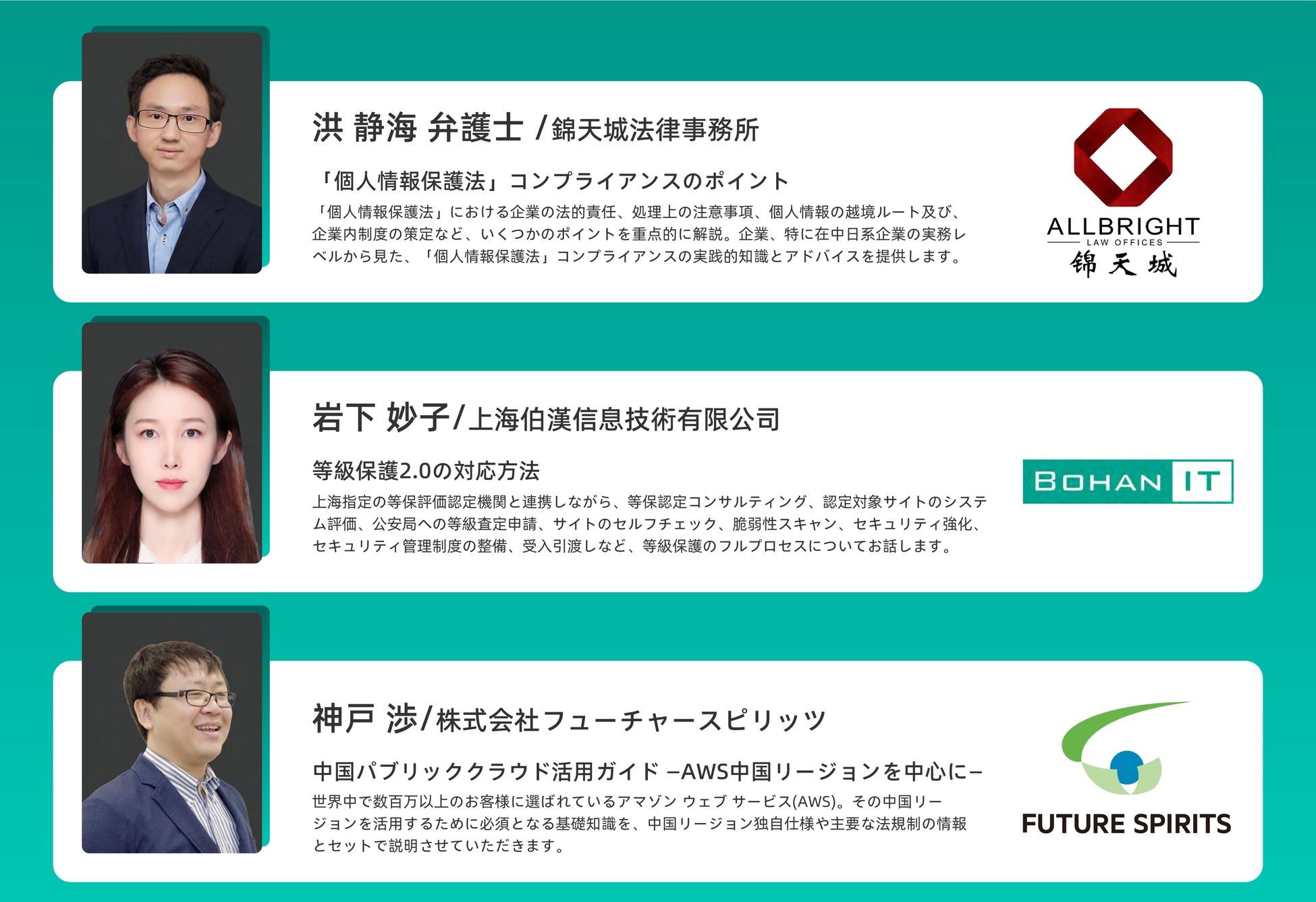 このセミナーでは、中国現地の大手法律事務所「錦天城法律事務所」、中国現地日系企業延べ1,000社以上のインターネットインフラ導入実績のある「上海伯漢信息技術有限公司」、そしてフューチャースピリッツにて、プライバシーファースト時代にITをトラブルなく活用するためのヒントをご提供させていただきます。