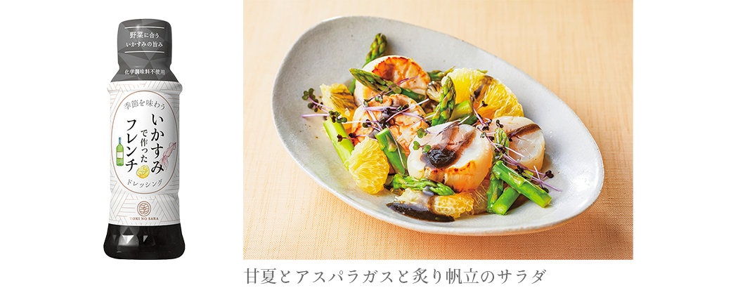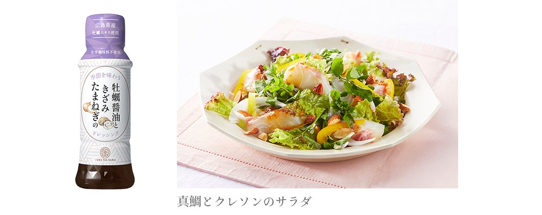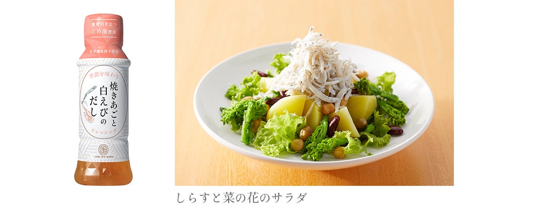 「季の皿」シリーズは、旬の食材と野菜をふんだんに使って作る「主菜・主食になる季節のサラダ」をご提案。ドレッシングを通じて、季節の移ろいを感じながら健やかに暮らす。作る人と食べる人がこころもおなかも満たされる食卓を応援します。だしや素材の旨みで上品な味わいに仕上げ、旬の食材の味をしっかり感じられるよう、化学調味料を加えていません。