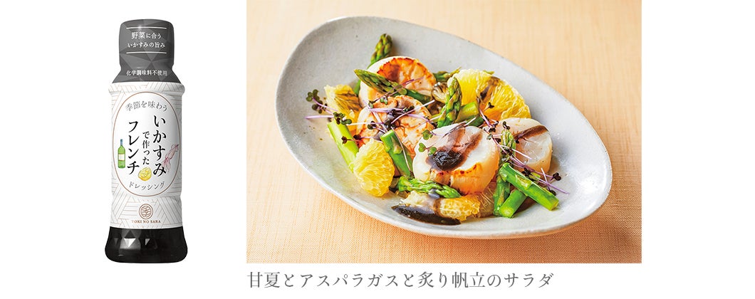 この度、追加アイテムとして『季の皿 いかすみフレンチドレッシング170』を新発売致します。さらに、ご愛顧いただいている『季の皿 焼きあごと白えびのだしドレッシング170』『季の皿 ハーブにんにくと淡路たまねぎのドレッシング170』『季の皿 牡蠣醤油ときざみたまねぎのドレッシング170』は、 よりおいしさが伝わりやすくなるようにパッケージをリニューアルし4アイテムのラインナップとしました。