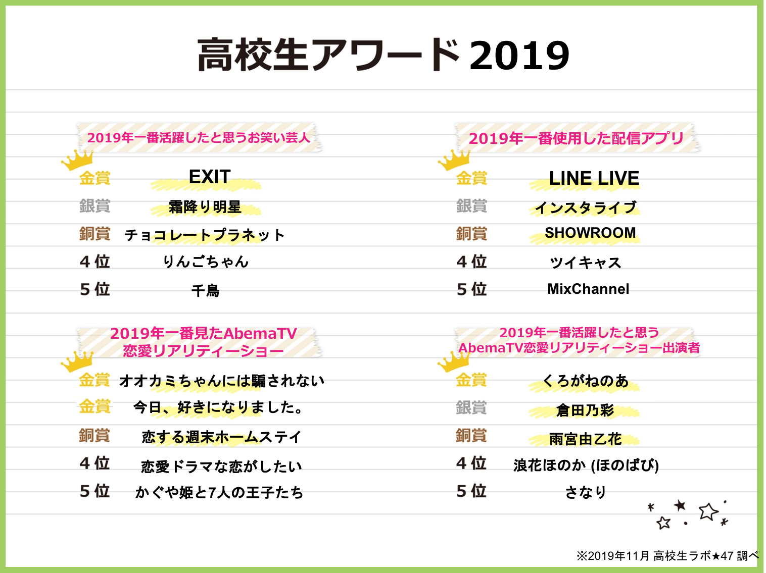 令和元年!高校生1,000名が選んだ『高校生アワード2019』を発表!昨年同様“タピリ”ながら“令和”に喜び“橋本環奈”見ながら“髭男”聴いて“EXIT”で笑った1年