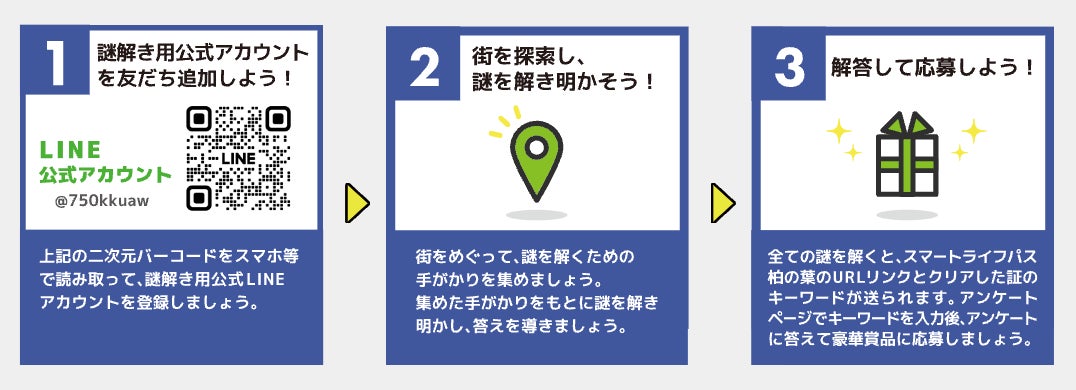 柏の葉にあるモノを題材にした「謎」がLINEを通して送られてくるので、街をめぐって手がかりを探しましょう。手がかりをもとに謎を解き明かし、LINEで解答します。