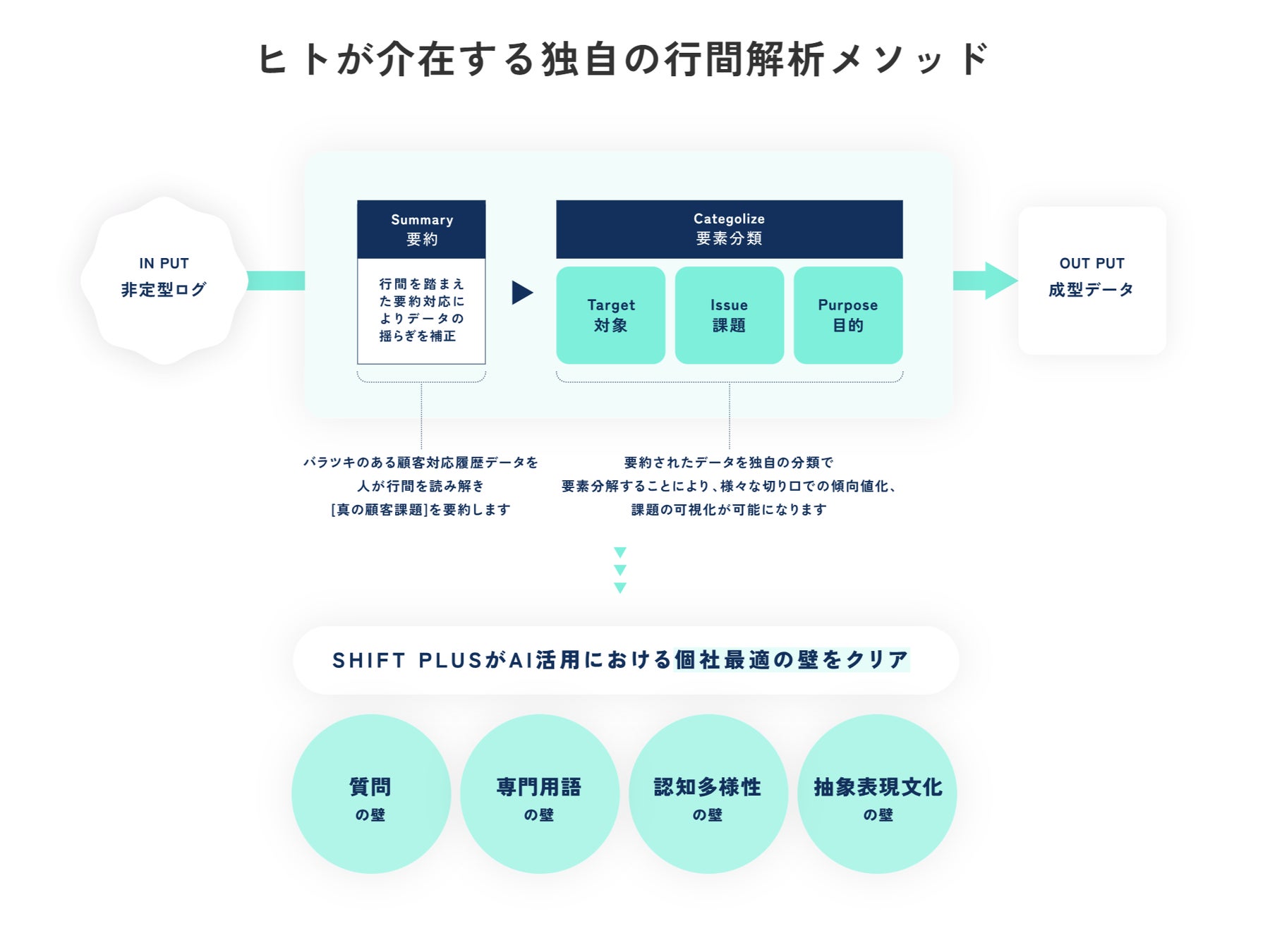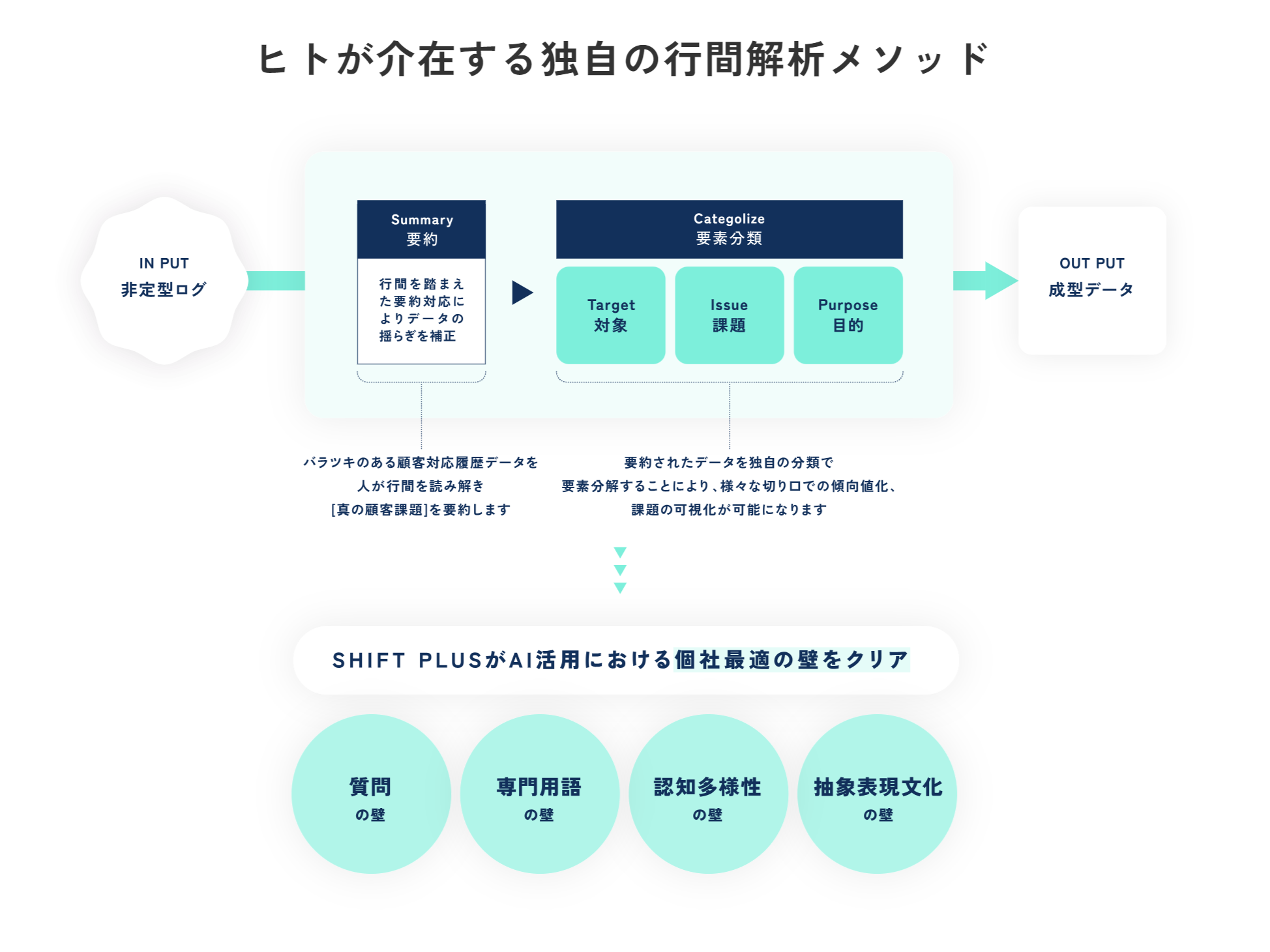 AI活用を見据えた場合に、カスタマーサポート領域やIT運用・ヘルプデスク関連の業務において導入を困難なものとしているのが行間解析です。阿吽のコミュニケーションなどに代表される抽象表現文化やサービス特性を加味した専門用語がCS自動化の壁になってきました。Voice Millは独自の行間解析メソッドを用い、人が介在することで、その壁を乗り越え、中長期的なAI活用を見据えた分析サービスの提供を行うことを可能とします。